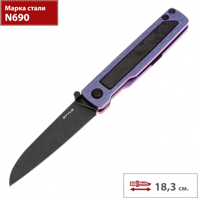 Рукоять ножа Style заслуживает отдельного внимания. Она изготовлена из анодированного титана — материала, который отличается высокой прочностью и легкостью, что делает нож невероятно удобным в ношении. Вставки из мраморного карбона придают рукояти стильный и неповторимый вид, подчеркивая индивидуальность ножа и создавая ощущение премиальности.